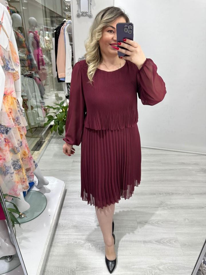 Bordo 2 Kat Üst İnce Pilise Alt Etek Kalın Pilise Şifon Elbise stp 26k2657