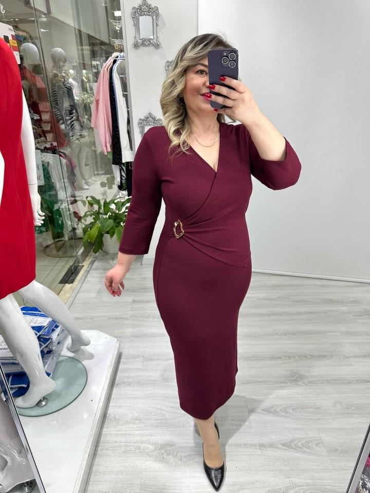 Bordo Kruvaze Yaka Gold Toka Detaylı Yandan Yırtmaçlı Truvakar Kol Elbise mc 5085 (TYSBUTİK002831)
