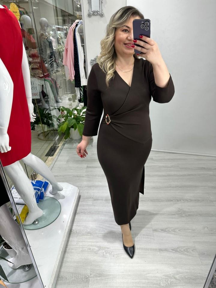 Kahverengi Kruvaze Yaka Gold Toka Detaylı Yandan Yırtmaçlı Truvakar Kol Elbise mc 5085 (TYSBUTİK002833)
