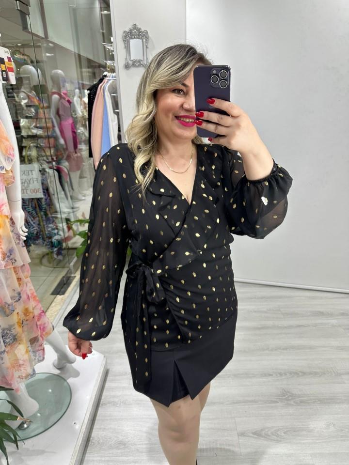 Premium Siyah Gold Puantiye Detaylı Yaka Volanlı Yandan Bağlamalı Bluz stp 26k1371