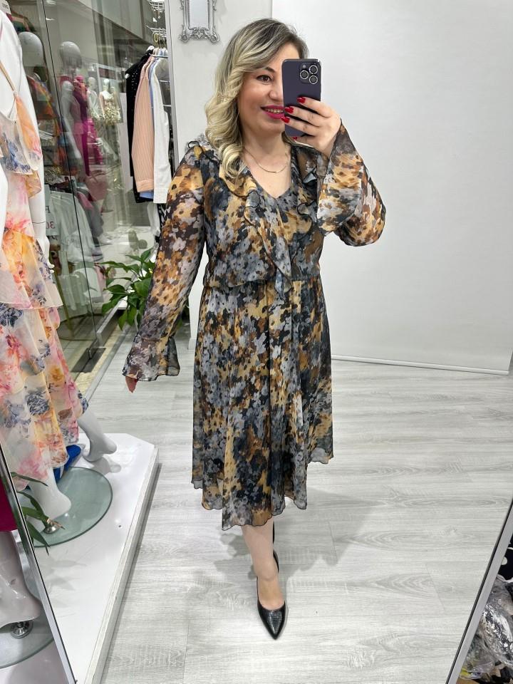 Siyah Gri Kahve Desenli Yakası Volanlı Yoryo Şifon Elbise stp 26k2668