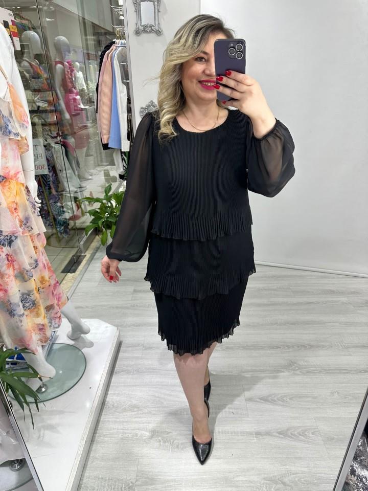 Siyah Premium İnce Piliseli 3 Katlı Uzun Kollu Şifon Elbise stp 26K2663 (TYSBUTİK002817)